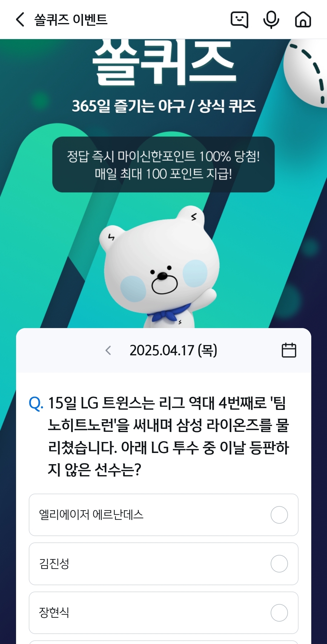 ㅡ신한 쏠야구 퀴즈4월17일 15일 LG트윈스는 리그 역대 4번째로 팀노히트노런을 써내며 삼성 라이온즈를 물리쳤습니다 아래 투수 중 등판하지 않