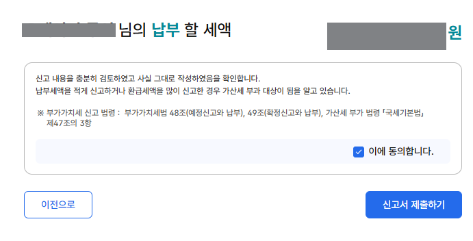 자, 다 됐으면, 마지막으로 금액을 한번 더 확인하고, ( 신고한 세액은...옆에 나오는 금액이 내가 내야될 세액이다)