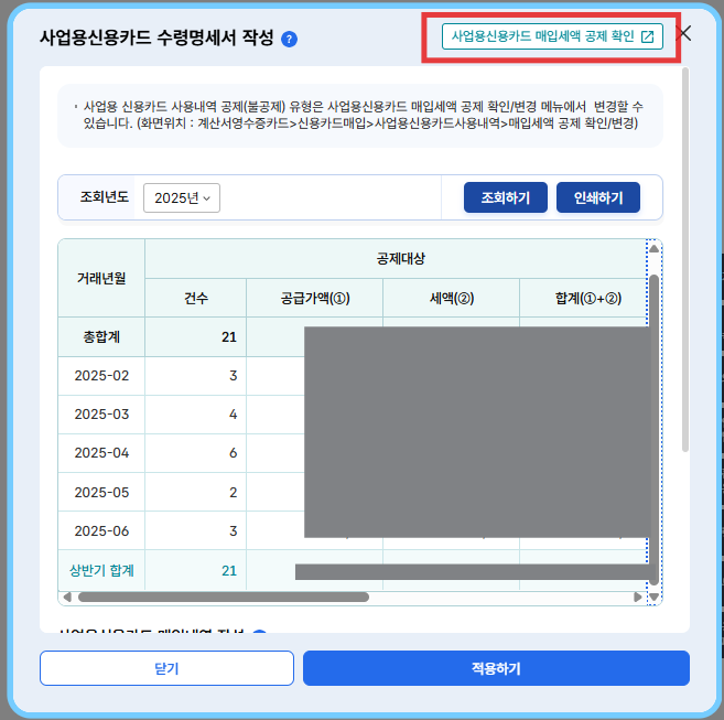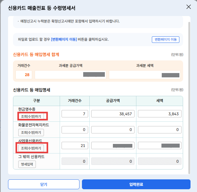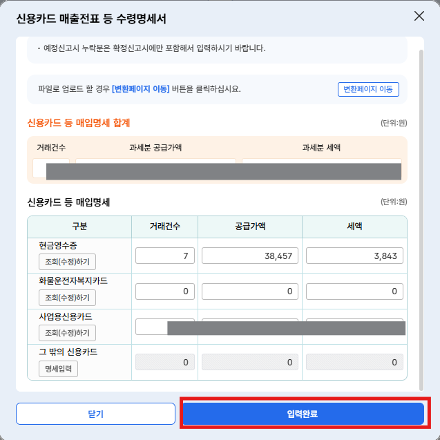 그럼, 돌아온 화면에서 '신용카드 등 매입명세 합계' 금액이 반영되어 변경된 걸 확인할 수 있다.