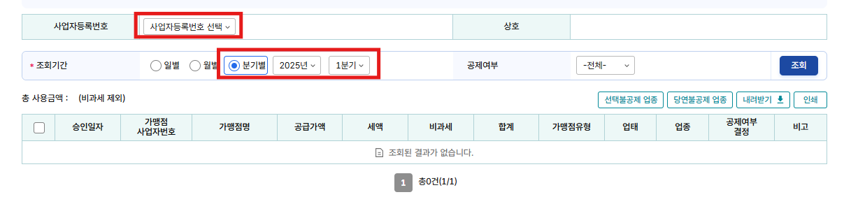 자, 이제 다음 팝업에서, 사업자등록번호를 선택하고, 조회기간을 분기별로 보면서, 필요한 내역을 공제,불공제 처리로 변경해 준다.