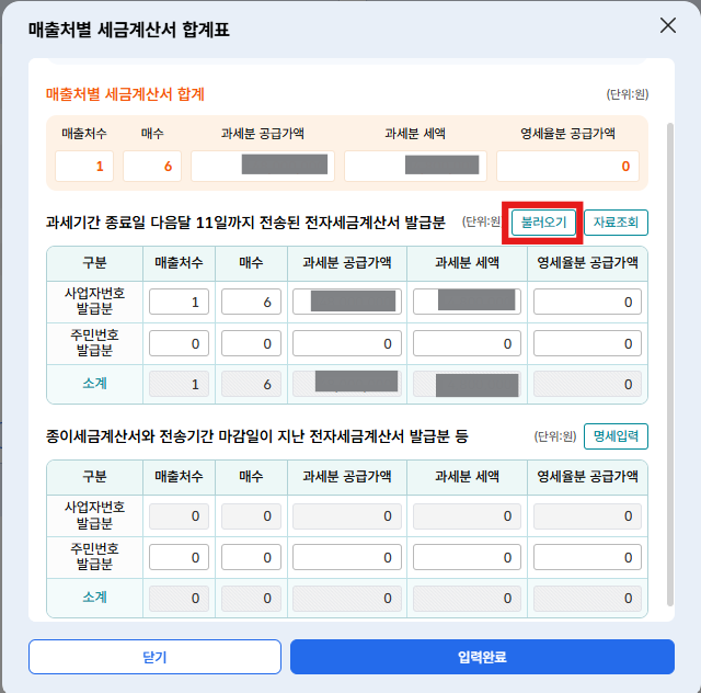 처음엔 빈칸으로 요렇게 뜨니, '이미 작성한 매출금액의 합계'금액과 동일한 금액을 작성하라고 안내하니,