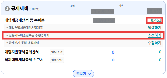 여기서 필요한 수정을 하기 위해 '사업용신용카드 매입세액 공제 확인'을 클릭해보자.