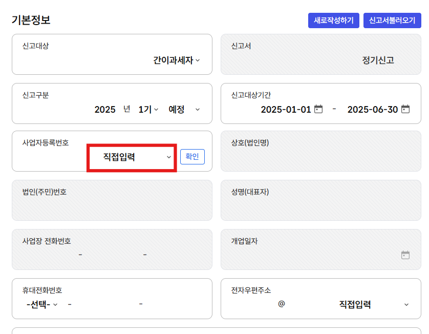 그러면 그 사업자번호에 등록된 정보들이 쫘~악 채우져서 불러옵니다.