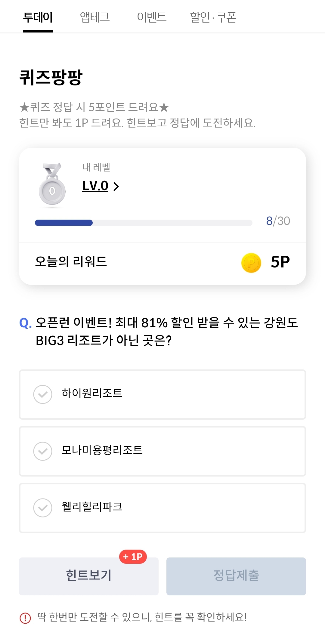 신한카드 신한 SOL페이 퀴즈팡팡 4월18일 오픈런 이벤트 최대 81% 할인 받을 수 있는 강원도 BIG3 리조트가 아닌 곳은 정답 알아볼게요