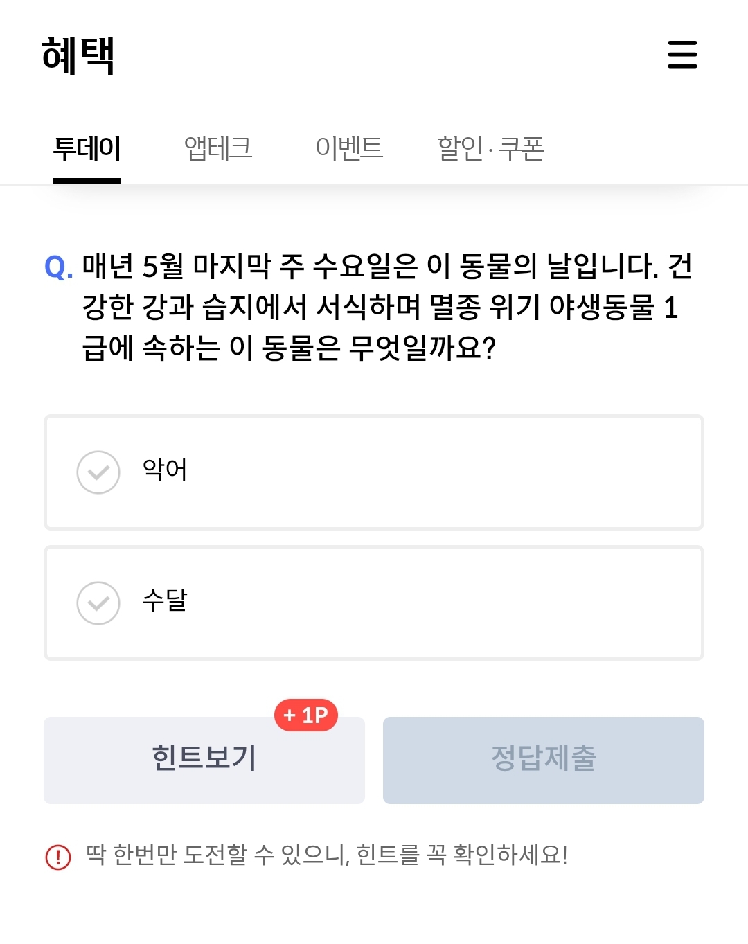 신한카드 5월28일 퀴즈팡팡 매년 5월 마지막주 수요일은 이 동물의 날입니다 건강한 강과 습지에서 서식하며 멸종 위기 야생동물 1급 정답 알아보아요