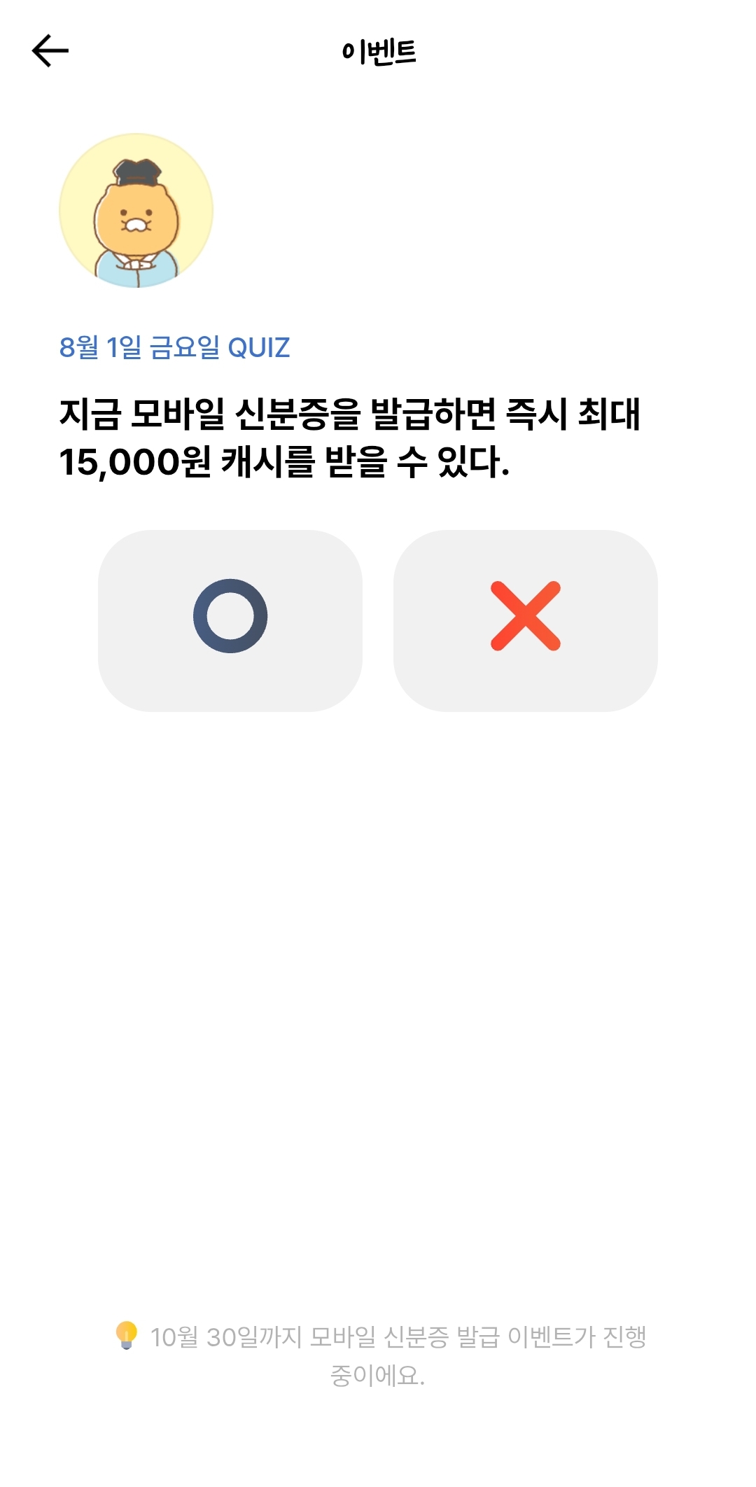 카카오뱅크 OX퀴즈 8월1일 모바일 신분증을 발급하면 즉시 최대 15,000원 캐시를 받을 수 있다 정답 알아볼게요