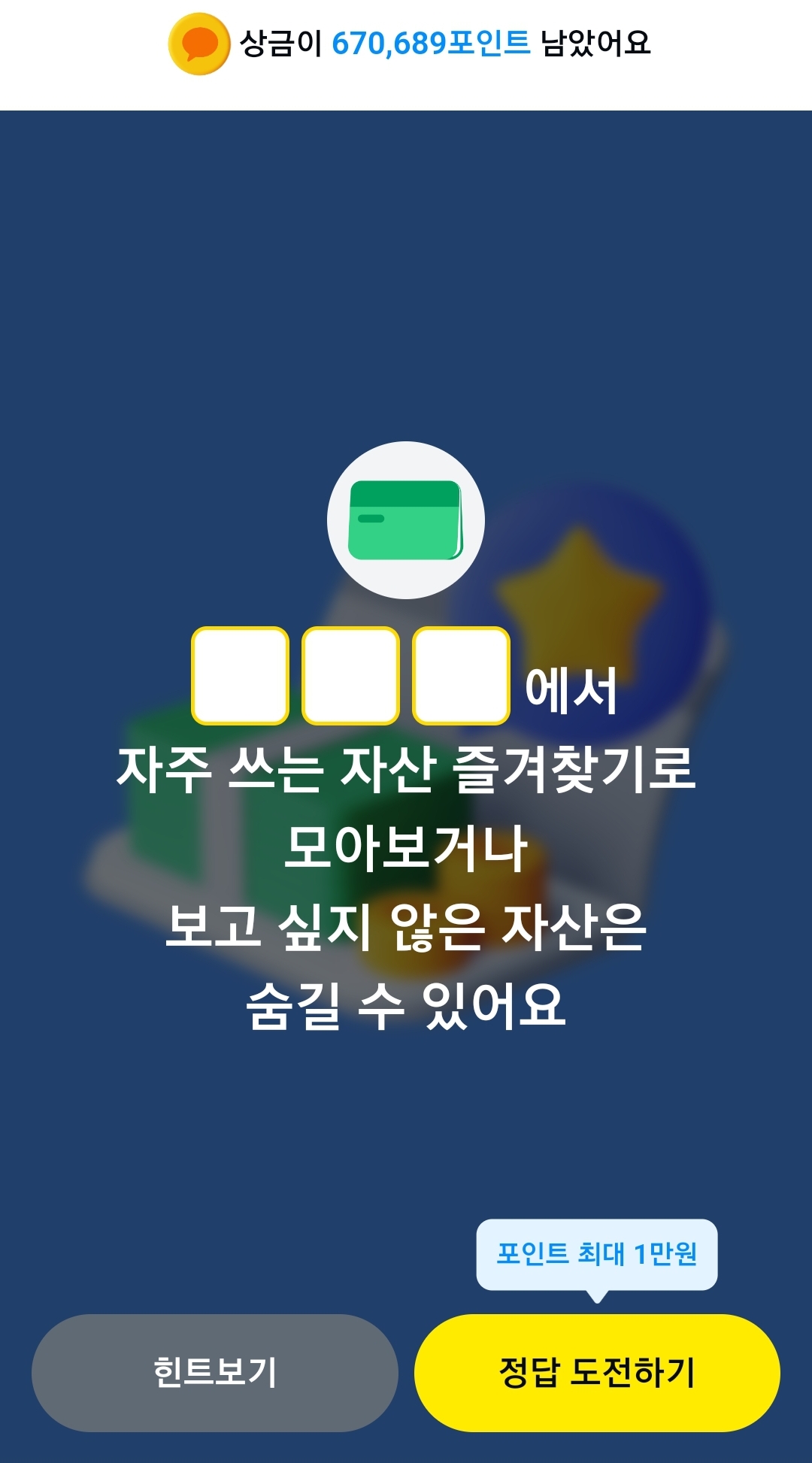 카카오페이 퀴즈타임 4월18일 OOO 에서 자주 쓰는 자산 즐계찾기로 모아보거나 보고 싶지 않은 자산은 숨길 수 있어요 정답 알아볼게요