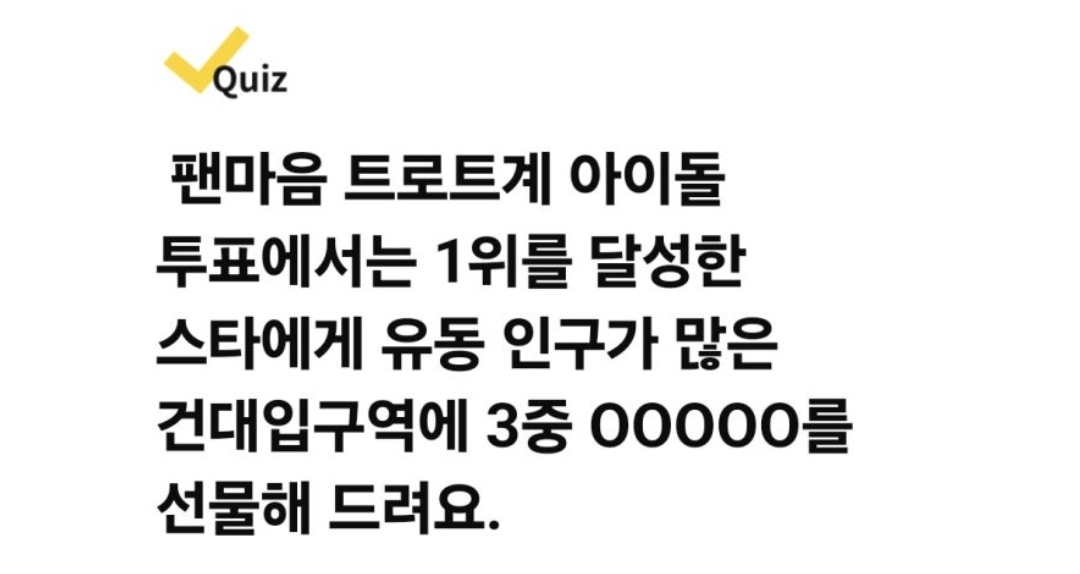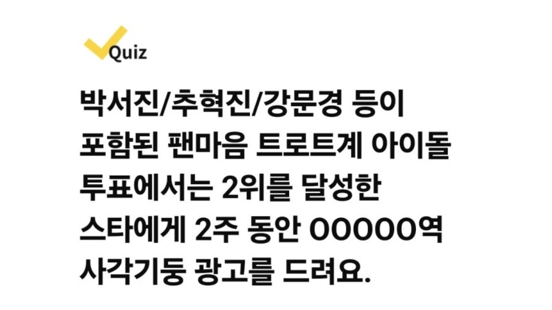 캐시딜 돈버는 퀴즈 팬마음에서 진행중인 OOOO 아이돌 투표에서는 1,2위를 달성한 스타에게 서울 핵심 지하철역 초대헝 광고/2위를 달성한 정답