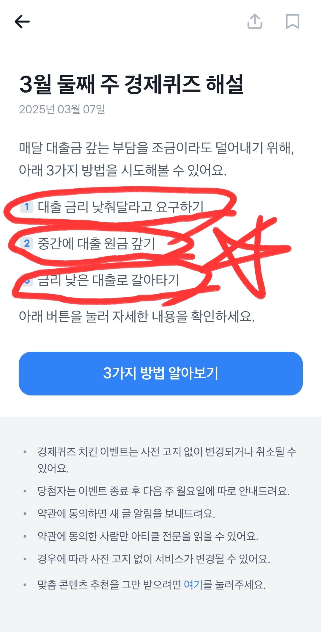 3월10일 토스 행운퀴즈 3월 둘째주 경제퀴즈 대출 받을 때 정해진 이자는 끝까지 그대로 내야한다 정답 알아볼게요.