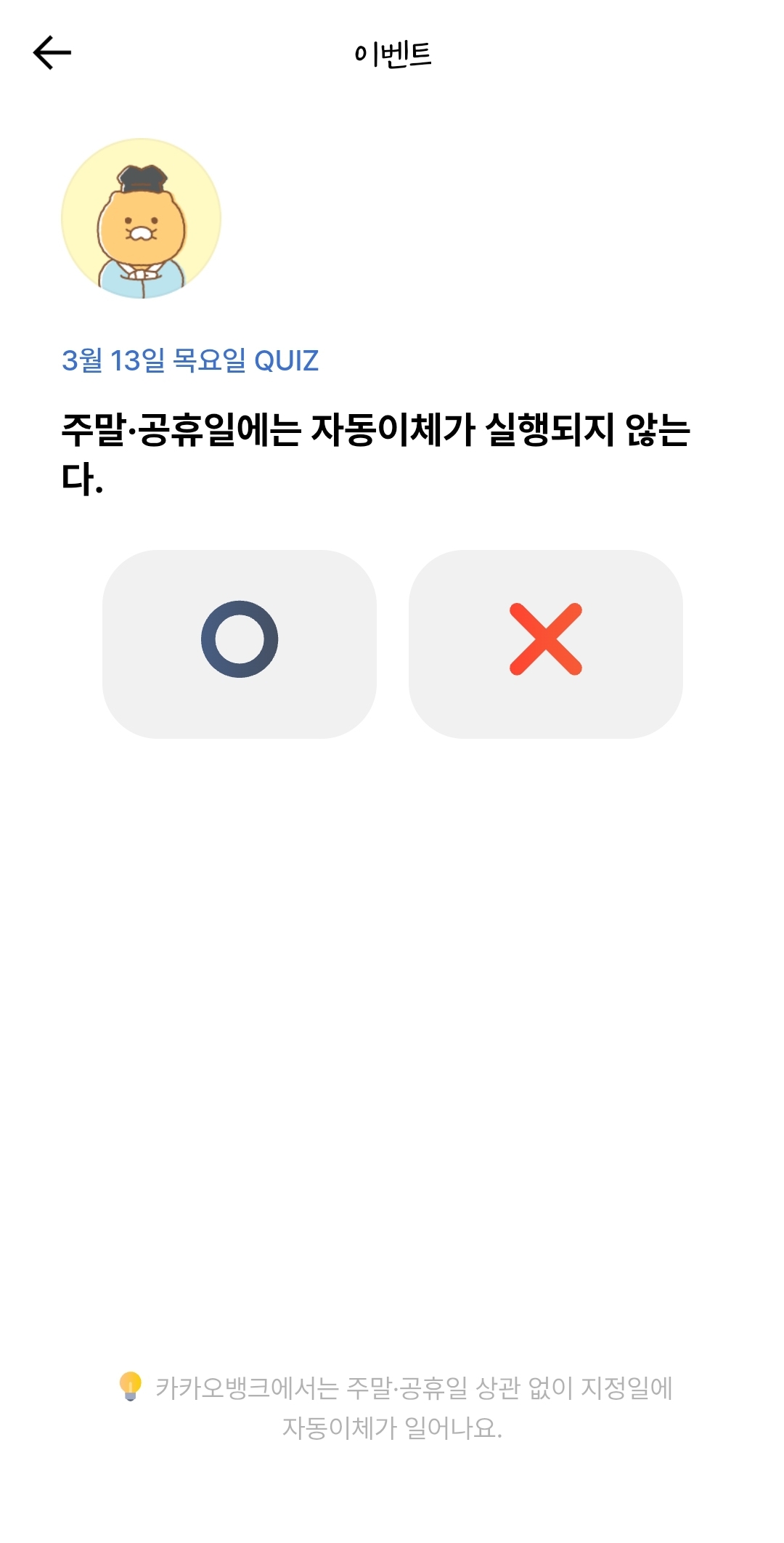 3월13일 카카오뱅크 OX퀴즈 주말.공휴일에는 자동이체가 실행되지 않는다 정답 알아볼게요.