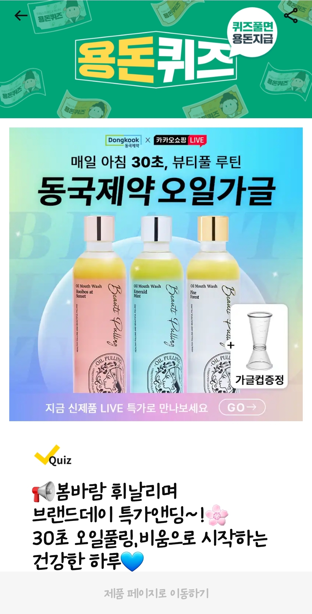 3월13일 캐시워크 용돈퀴즈 동국제약 오일가글 봄바람휘날리며 라이브 중 뷰티풀링 오일가글 본품 구매 정답 알아볼게요.