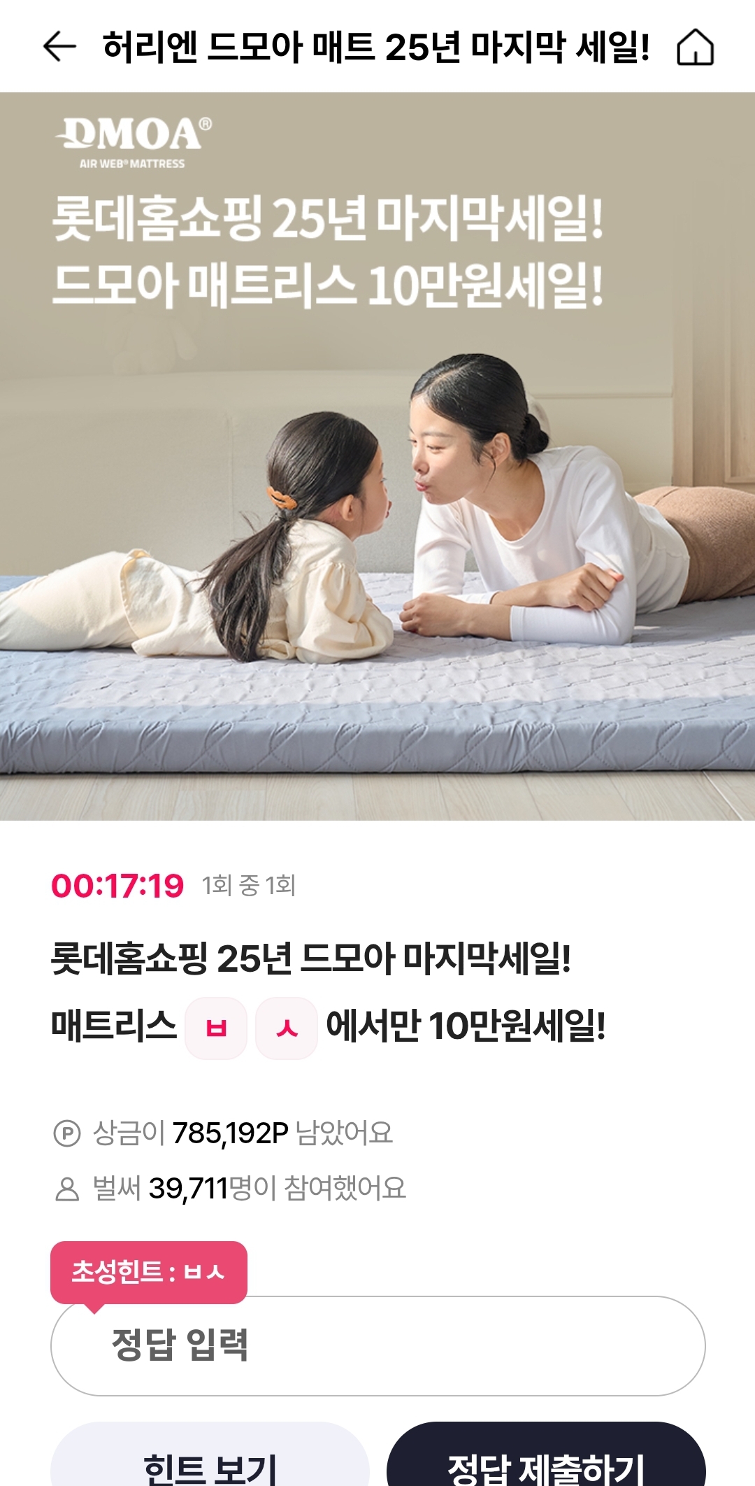 3월14일 OK캐시백 오퀴즈 롯데홈쇼핑 25년 드모아 마지막 세일! 매트리스 ㅂㅅ 에서만 10 만원세일 정답 알아볼게요.