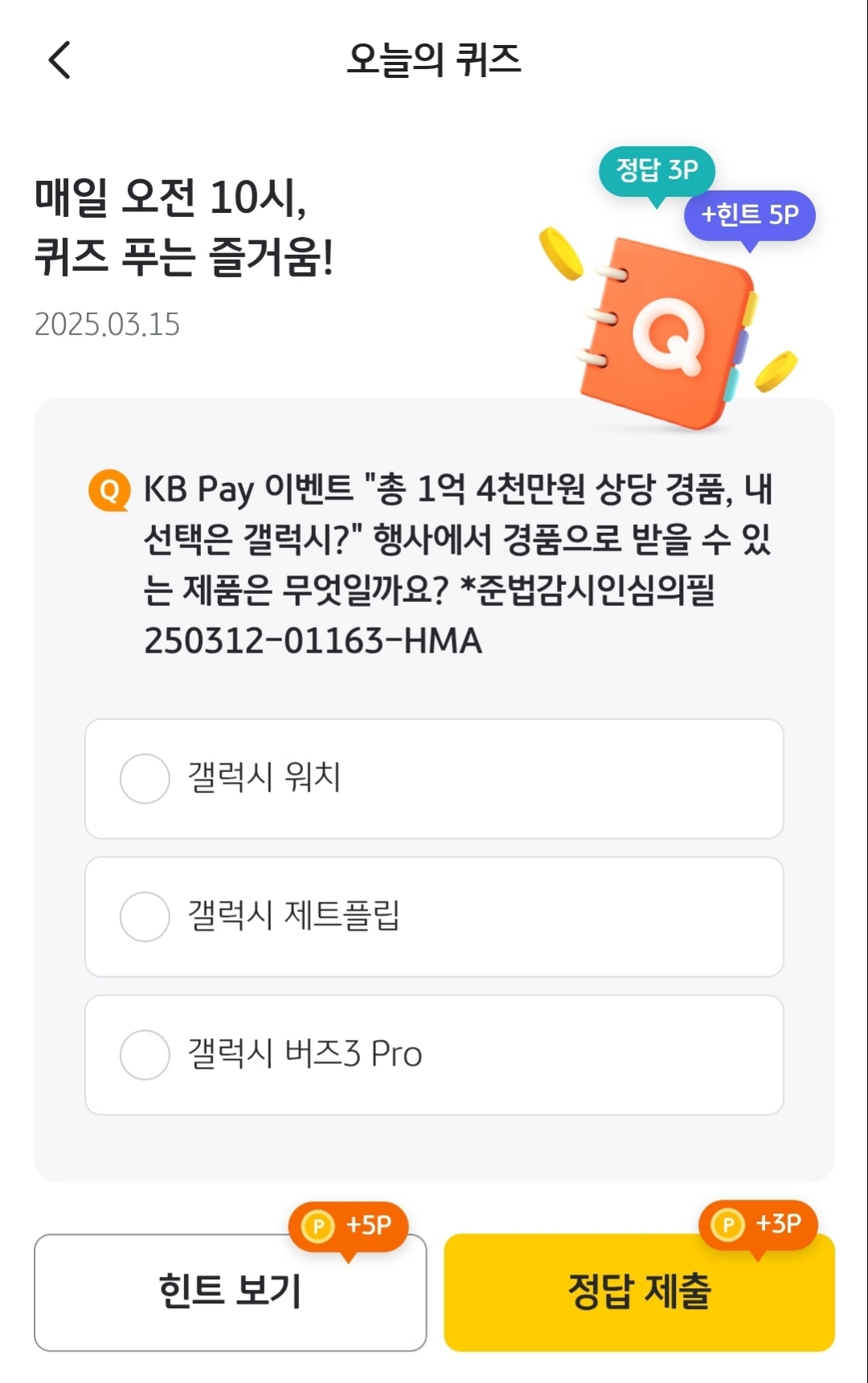 3월15일 KB페이 오늘의 퀴즈 KB Pay 이벤트 총1억4천만원 상당 경품 내 선택은 갤럭시 행사에서 경품으로 받을 수 있는 제품은 정답