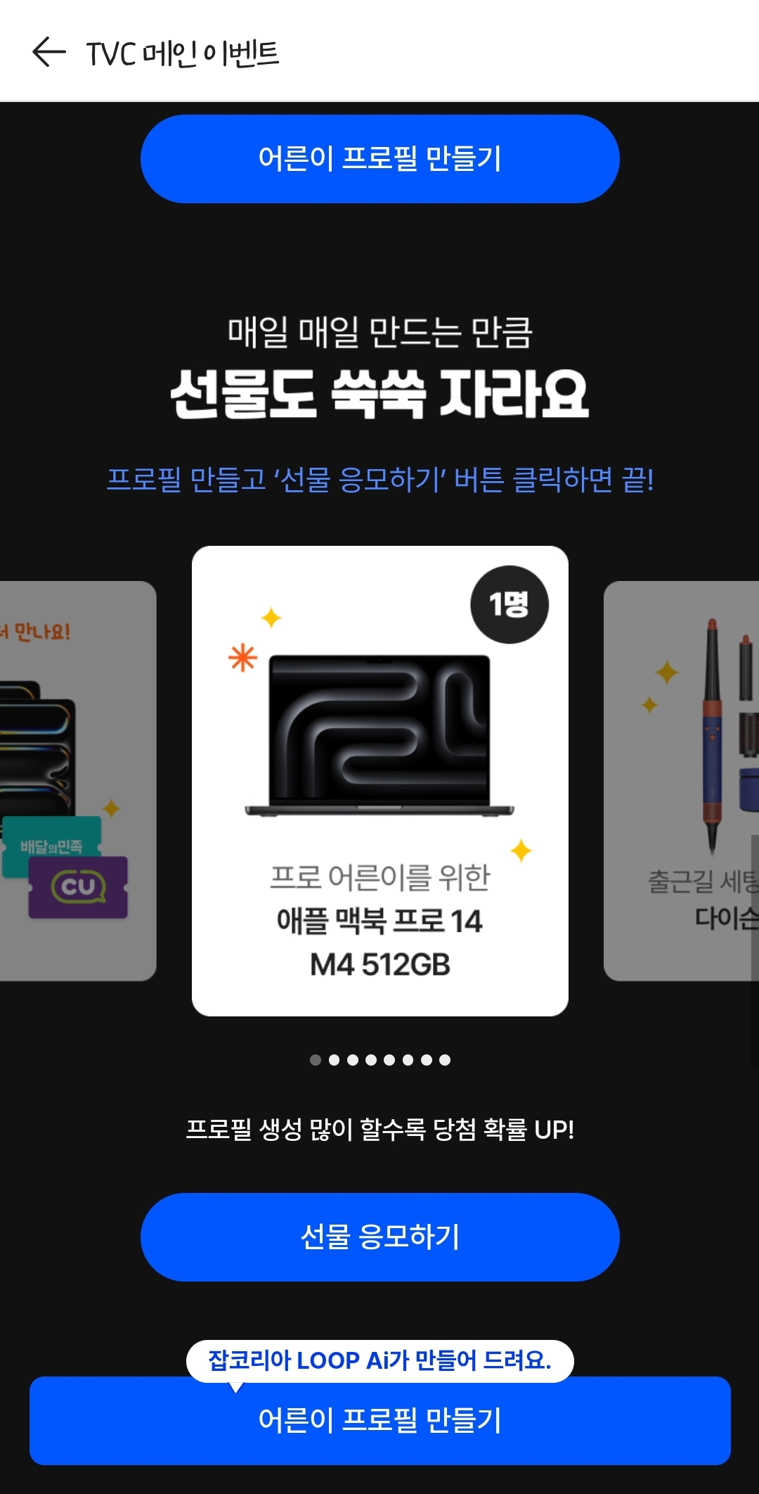 3월17일 토스 잡코리아 AI 프로필 생성 이벤트 매일매일 프로필 만들고 OOOOOO 누르면 선물이 쑥쑥 자라요 정답 알아볼게요.