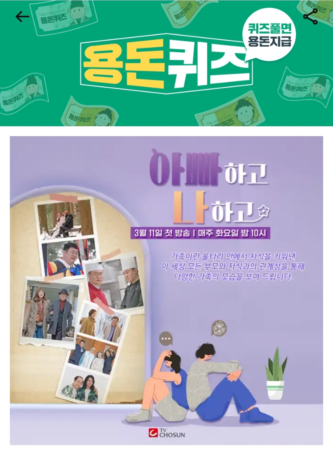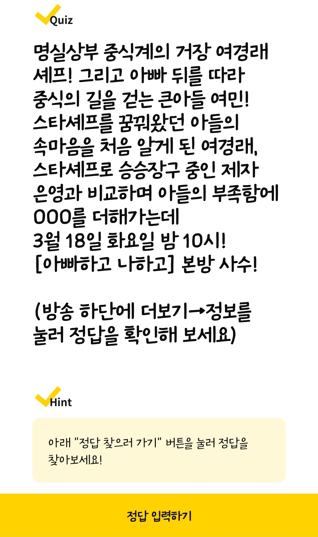 3월18일 캐시닥 용돈퀴즈 명실상부 중식계의 거장 여경래셰프 그리고 아빠 뒤를 따라 중식의 길을걷는 큰아들 여민! 스타셰프를 꿈꿔왔던 아들 정답