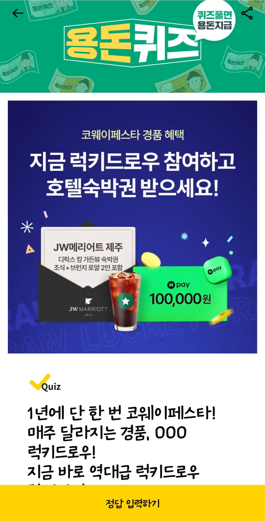 지금 바로 역대급 럭키드로우 참여하면 JW메리어트 제주 호텔 숙박권 당첨 찬스