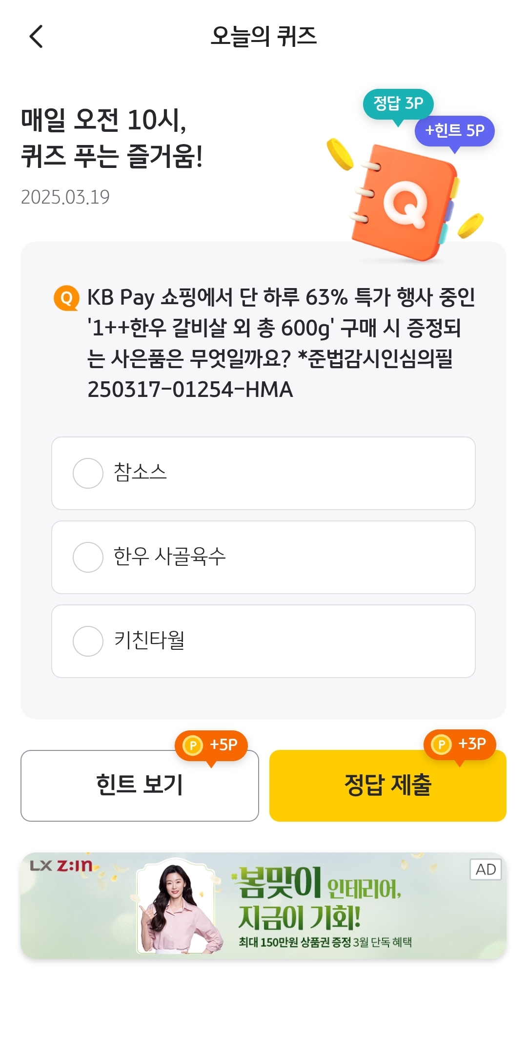 3월19일 KB Pay 오늘의 퀴즈 KB Pay 쇼핑에서 단 하루 63% 특가 행사 중인 1++ 한우 갈비살 외 총600g 구매 시 증정되는