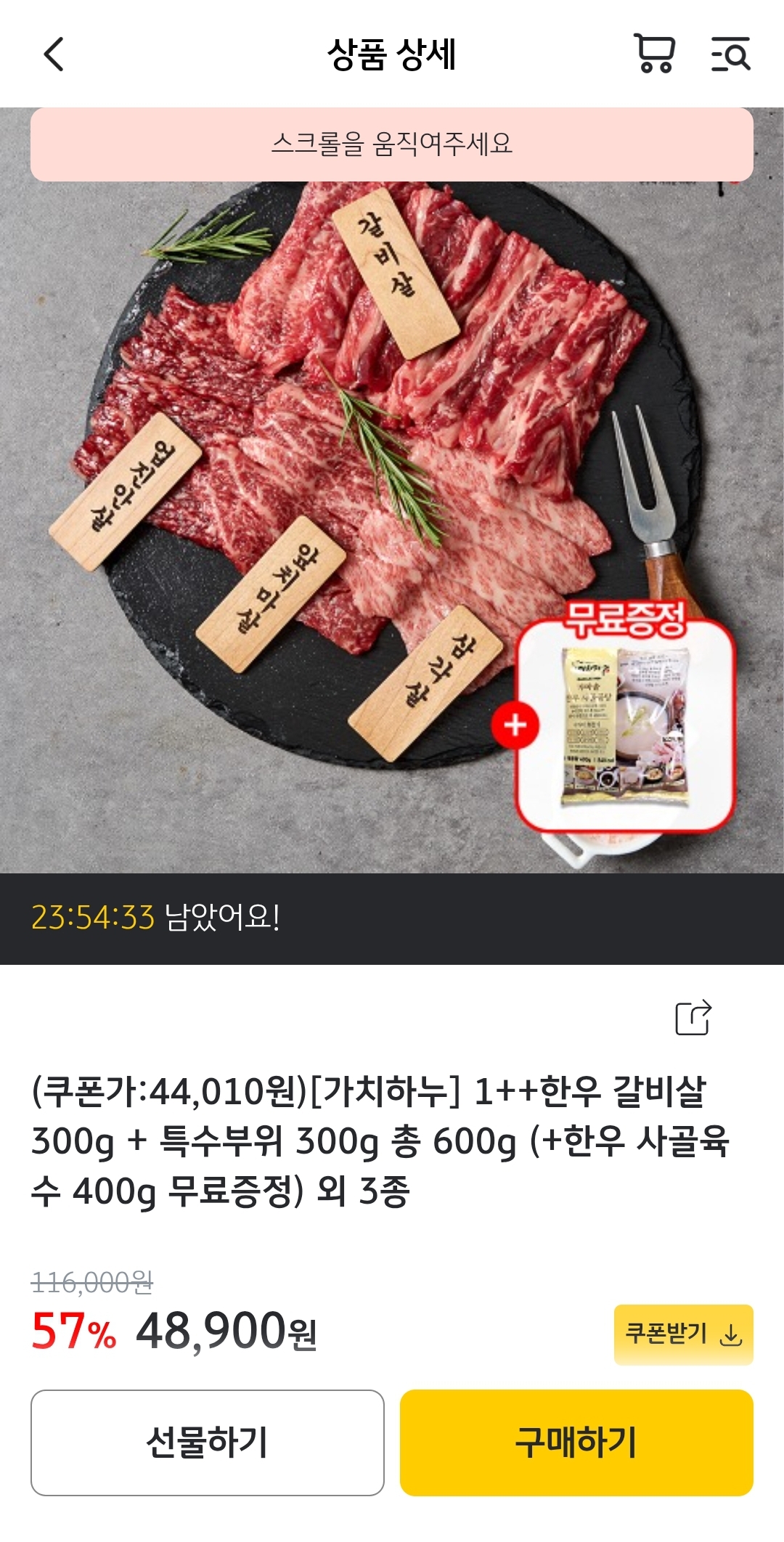 KB Pay 쇼핑에서 단 하루 63% 특가 행사 중인 '1++ 한우 갈비살 외 총600g' 구매 시 증정되는 사은품은 무엇일까요?