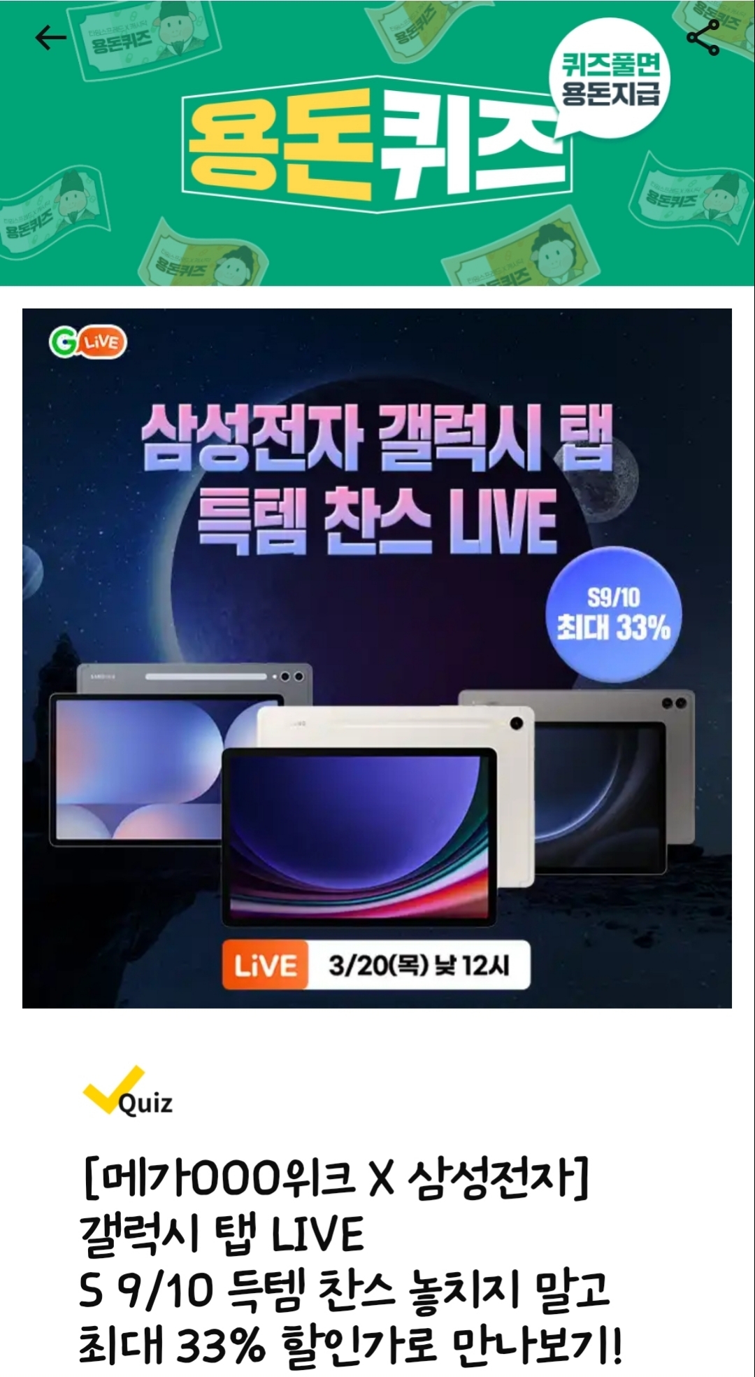3월20일 캐시닥 용돈퀴즈 메가ooo위크 X 삼성전자 갤럭시탭 LIVE S 9/10 득텡찬스 놓치지 말고 정답 알아보아요