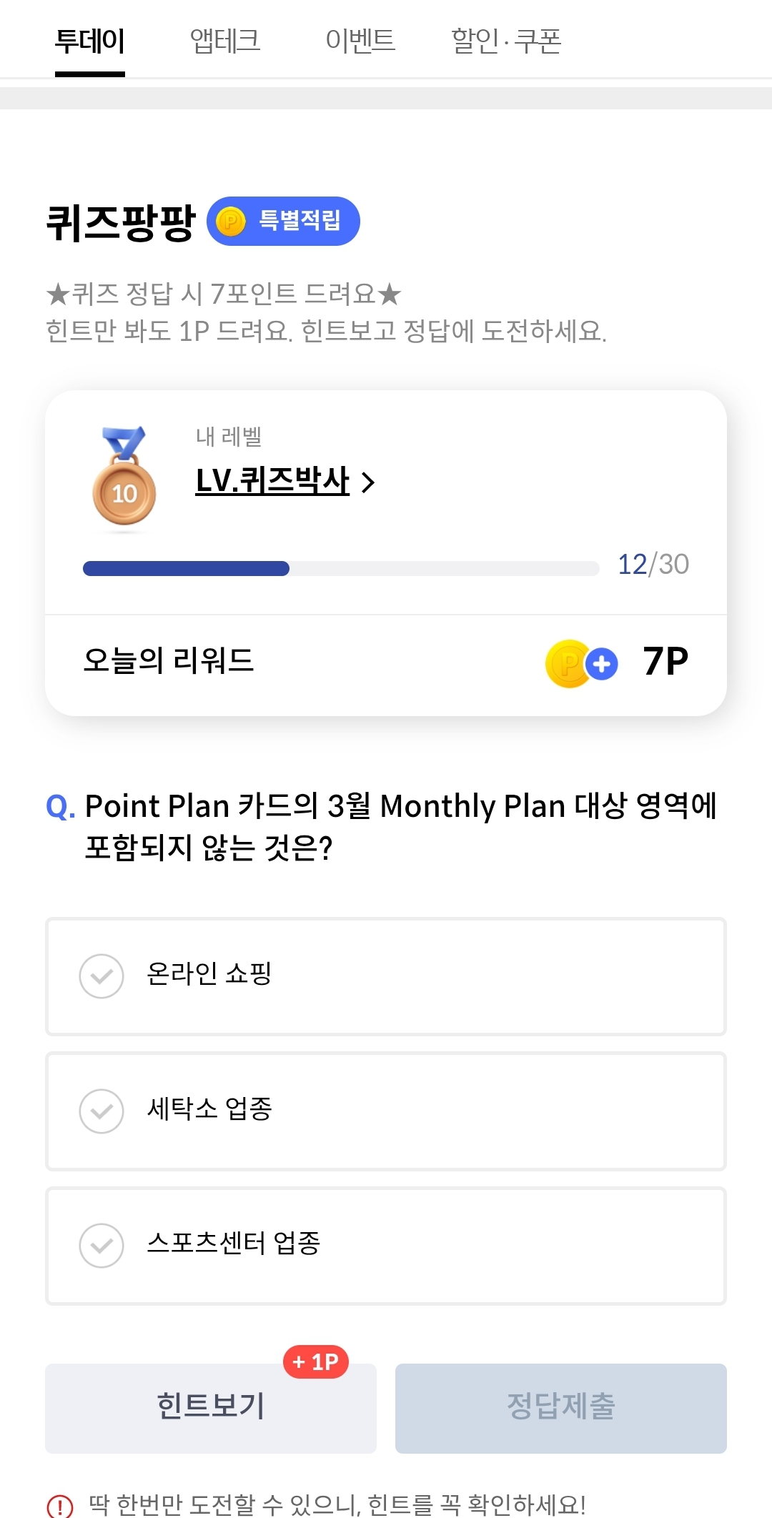 3월21일 신한쏠페이 퀴즈팡팡 Point Plan 카드의 3월 Monthly Plan 대상 영역에 포함되지않는 것은 정답 알아볼게요