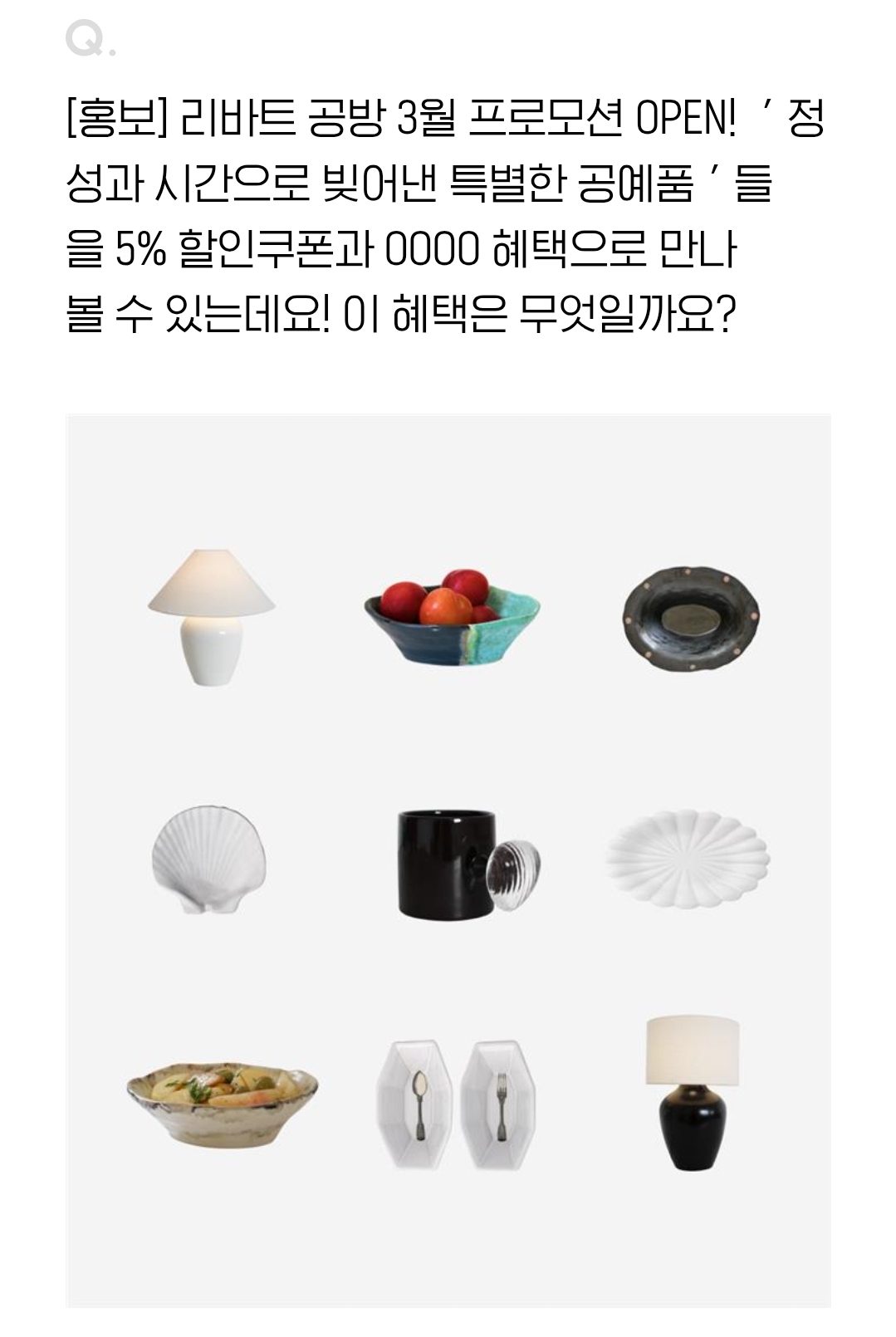 3월21일 H.POINT 오늘의 퀴즈 리바트 공방 3월 프로모션 OPEN 정성과 시간으로 빚어낸 특별한 공예품들을 5%할인쿠폰과 OOOO 혜택 정답 알아볼게요