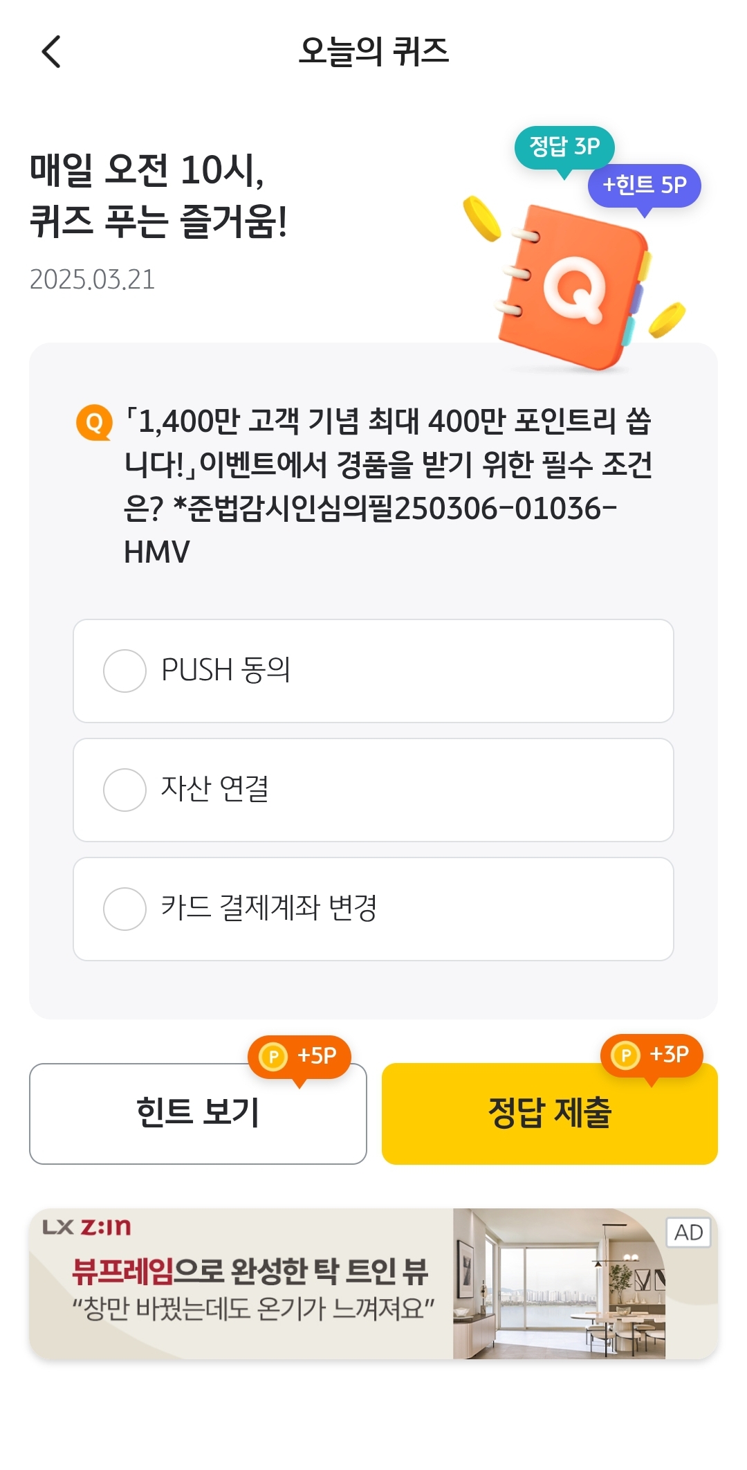 3월21일 KB Pay 오늘의 퀴즈 1400만 고객 기념 최대 400만 포인트리 쏩니다 이벤트에서 경품을 받기 위한 필수 조건은? 정답 알아볼게요