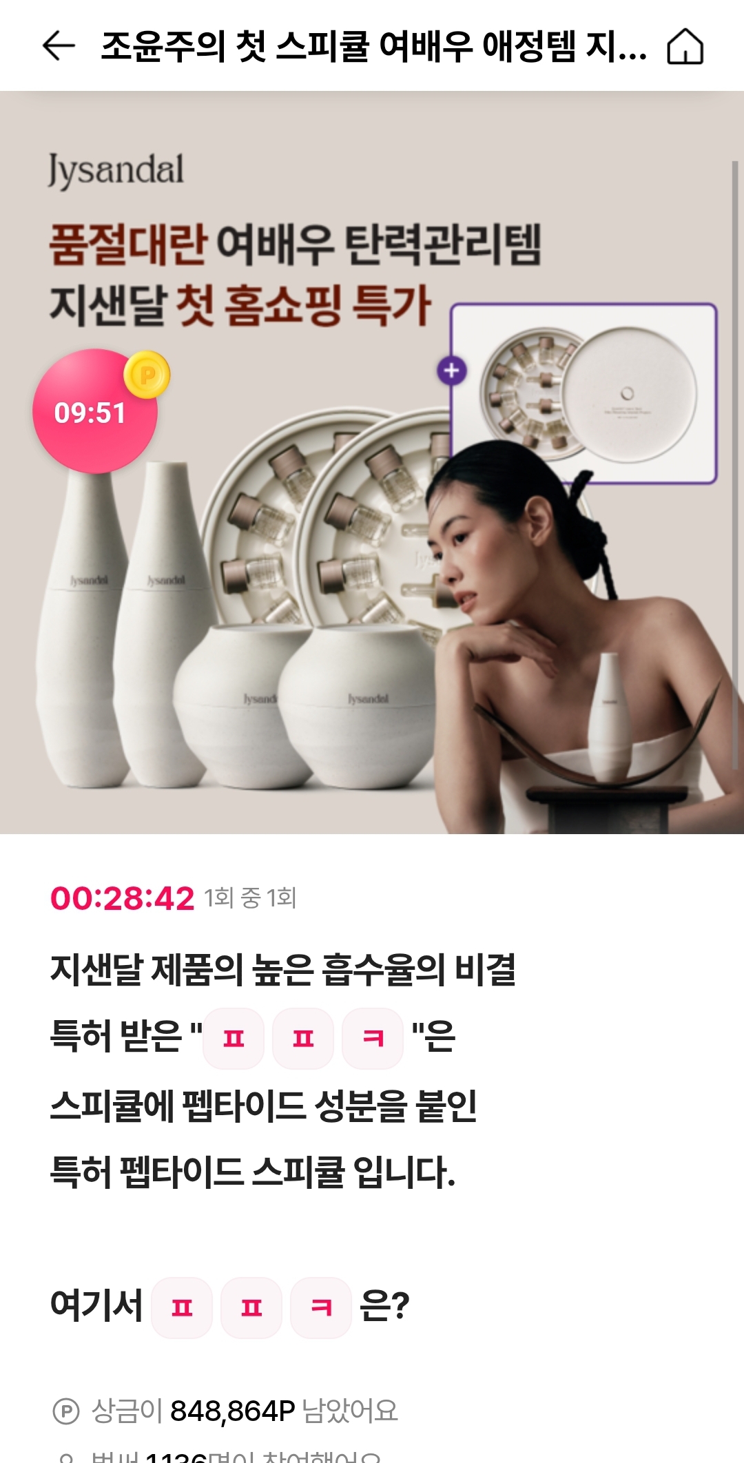 3월30일 오케이캐시백 오퀴즈 지샌달제품의 높은 흡수율의 비결은 특허받은 ㅍㅍㅋ 은 스피큘에 펩타이드 성분을 붙인 특허 펩타이드 스피큘 정답