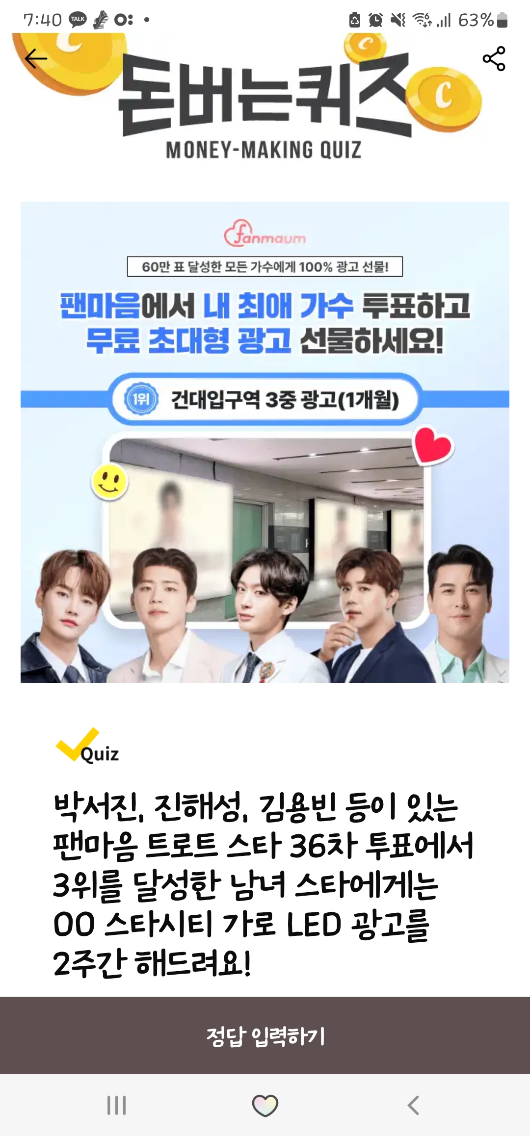 팬마음에서 내 최애 가수에 투표하고 무료 초대형광고
