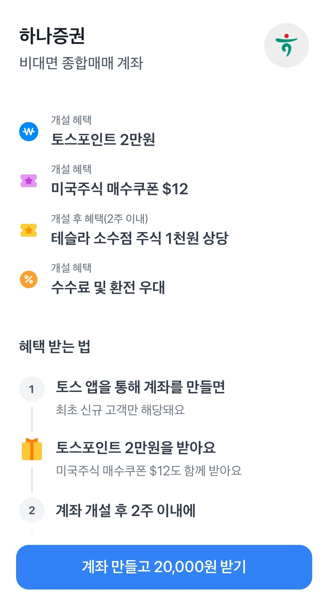 하나증권 OOOOOOO 신규계좌 개설하고 토스포인트 20,000원 받기