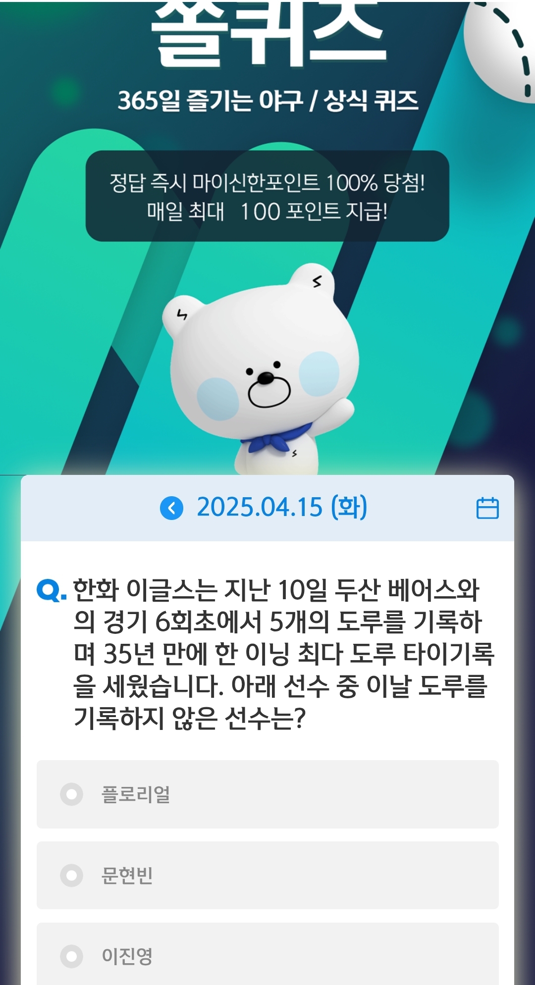 4월15일 신한 쏠야구 한화 이글스는 지난 10 일 두산 베어스와의 경기 6회초에서 5개의 도루를 기록하며 35년만에 한이닝 최다 도루 정답