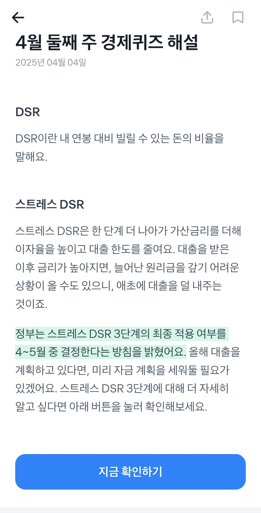 4월7일 토스 경제퀴즈 스트레스 DSR 이 적용되면 내가 받을 수 있는 대출금은 줄어든다 정답 알아볼게요