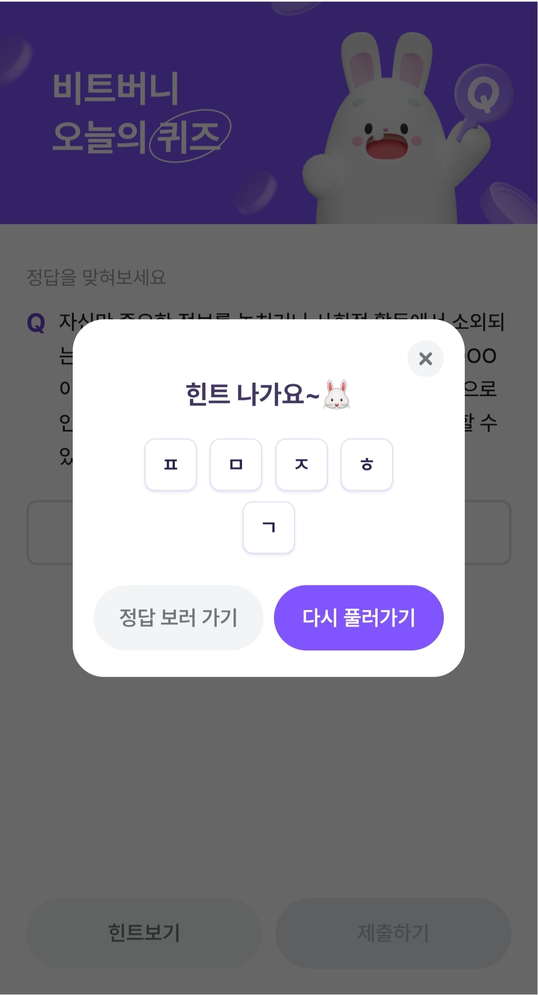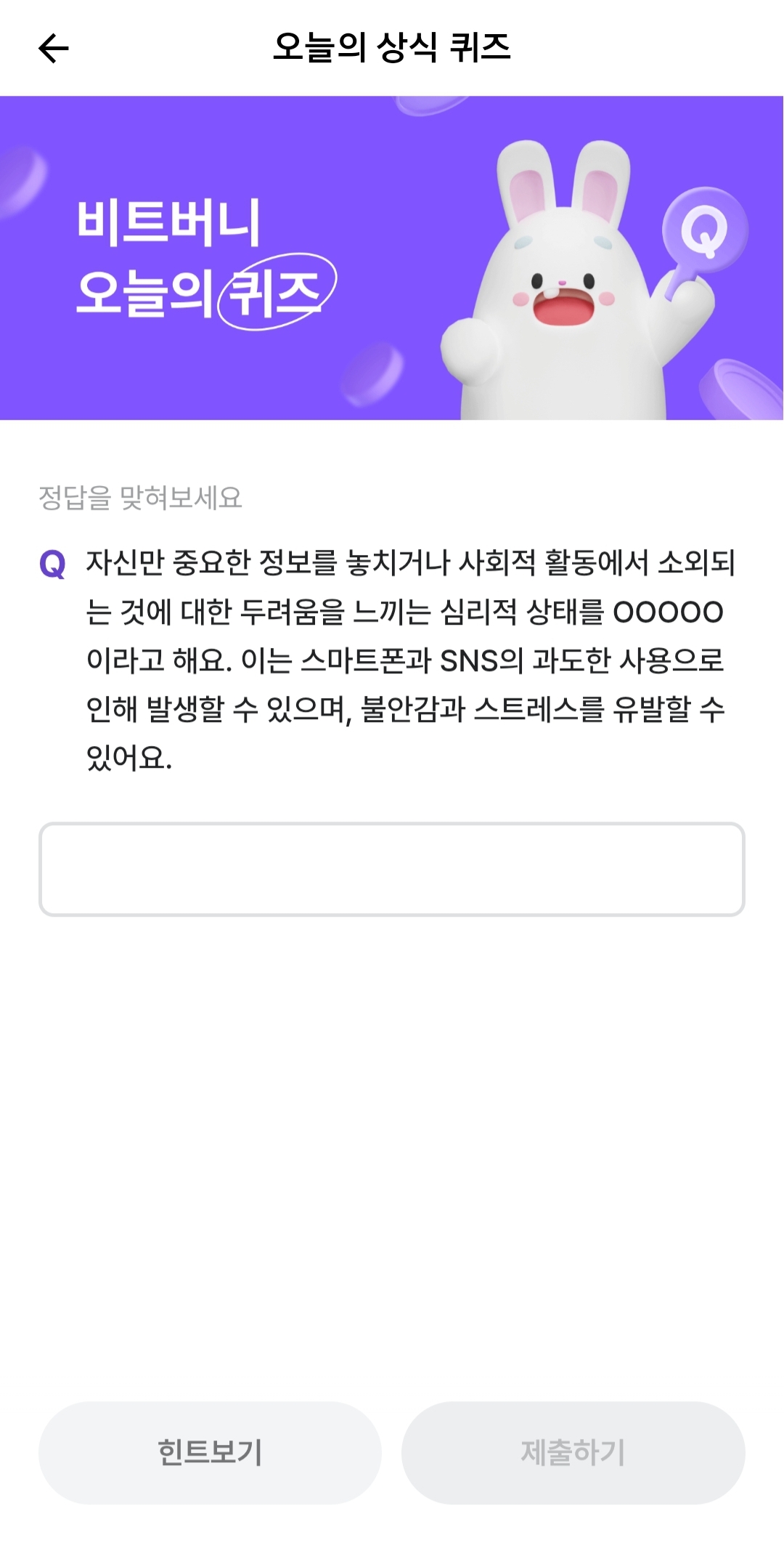 4월9일 비트버니 오늘의 상식퀴즈 자신만 중요한 정보를 놓치거나 사회적 활동에서 소외되는 것에 대한 두려움을 느끼는 심리적 상태 ㅍㅁㅈㅎㄱ 정답 알아볼게요