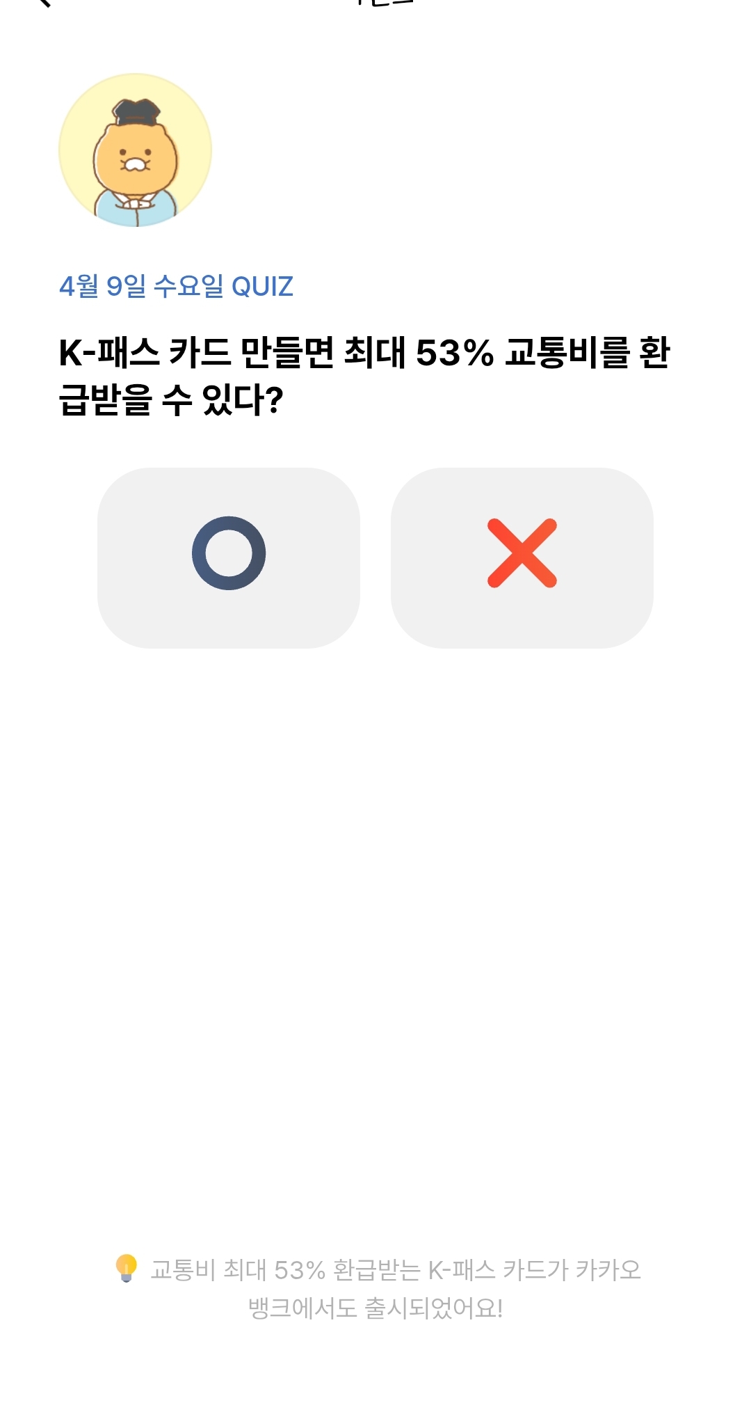 4월9일 카카오뱅크 OX퀴즈 K-패스 카드 만들면 최대53% 교통비를 환급받을 수 있다 정답 알아볼게요