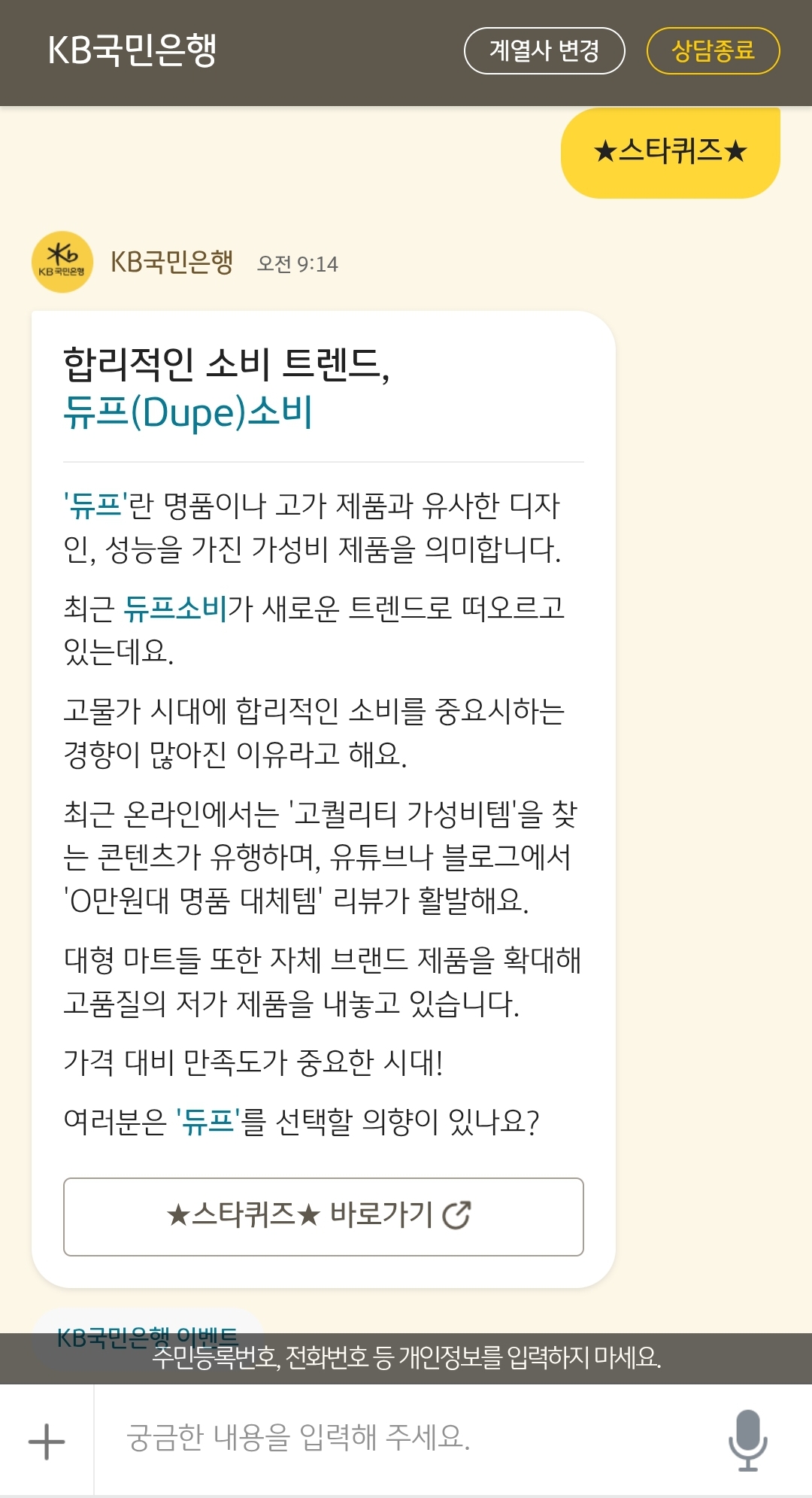 4월9일 KB 국민은행 스타퀴즈 최근 명품이나 고가제품보다는 유사한 디자인,성능을 갖춘 가성비제품을 소비하는 트랜드 정답 알아볼게요