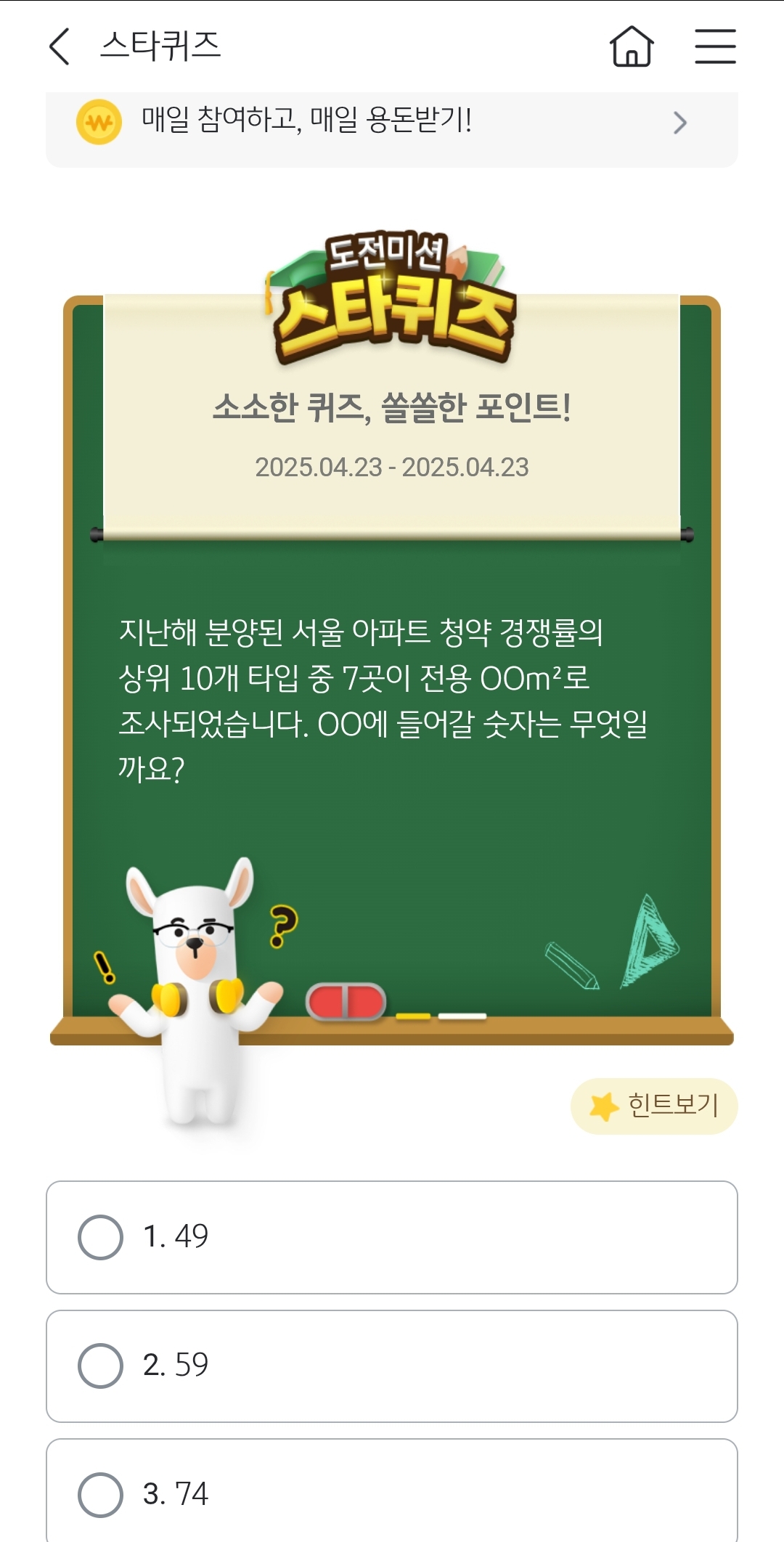 KB 국민은행 스타퀴즈 지난해 분양된 서울 아파트 청약 경쟁율의 상위 10개 타입 중 7곳이 OOm2 로 조사되었습니다 정답 알아볼게요
