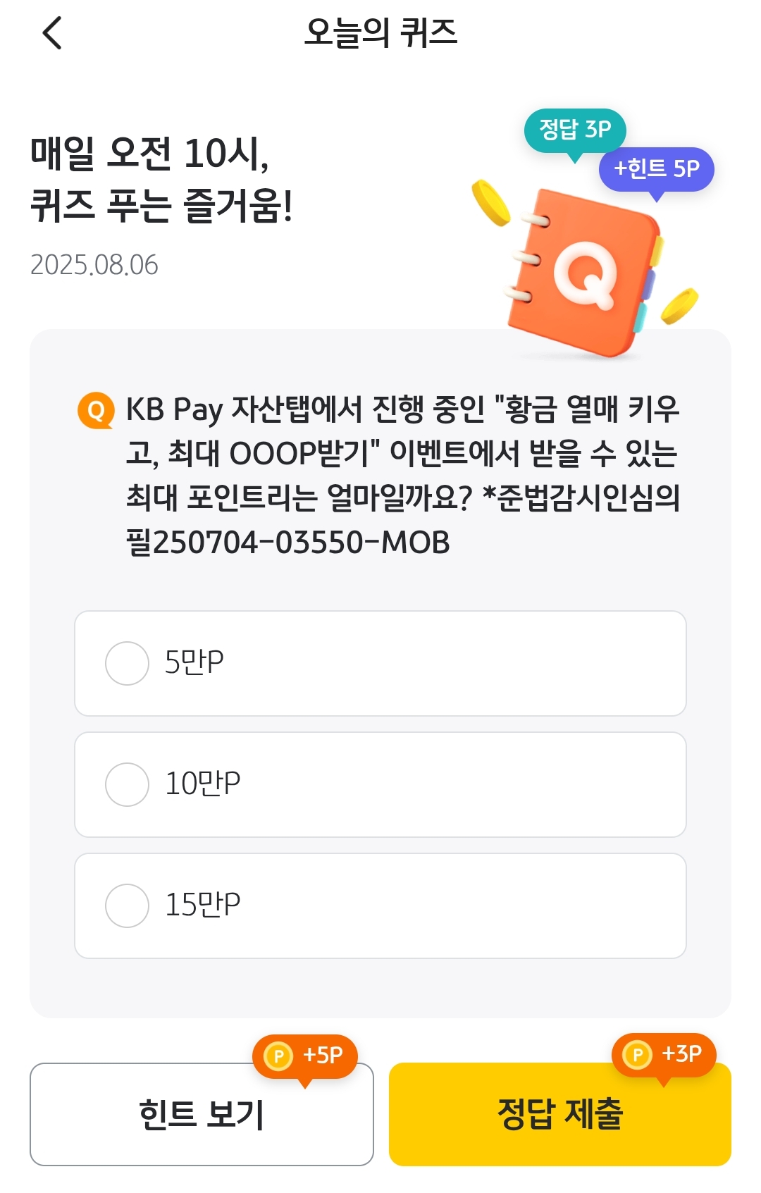 KB PAY 오늘의퀴즈 8월6일 자산탭에서 진행 중인 황금 열매 키우고 최대 OOOP 받기 이벤트에서 받을 수 있는 최다 포인트 정답