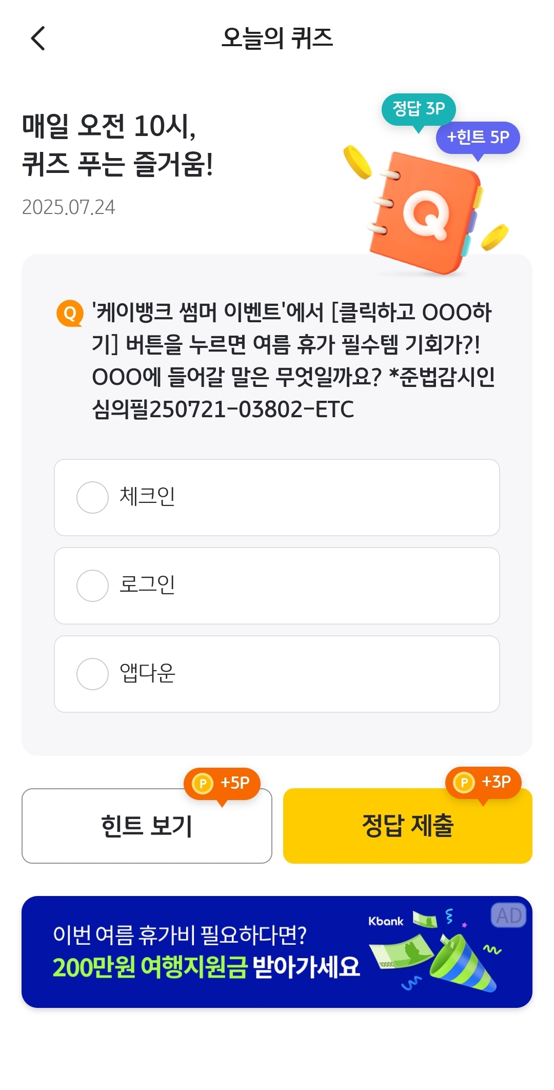오늘은 KB PAY 7월24일 오늘의퀴즈 케이뱅크 썸머 이벤트에서 클릭하고 OOO하기 버튼을 누르면 여름 휴가 필수템 기회가 정답 알아볼게요